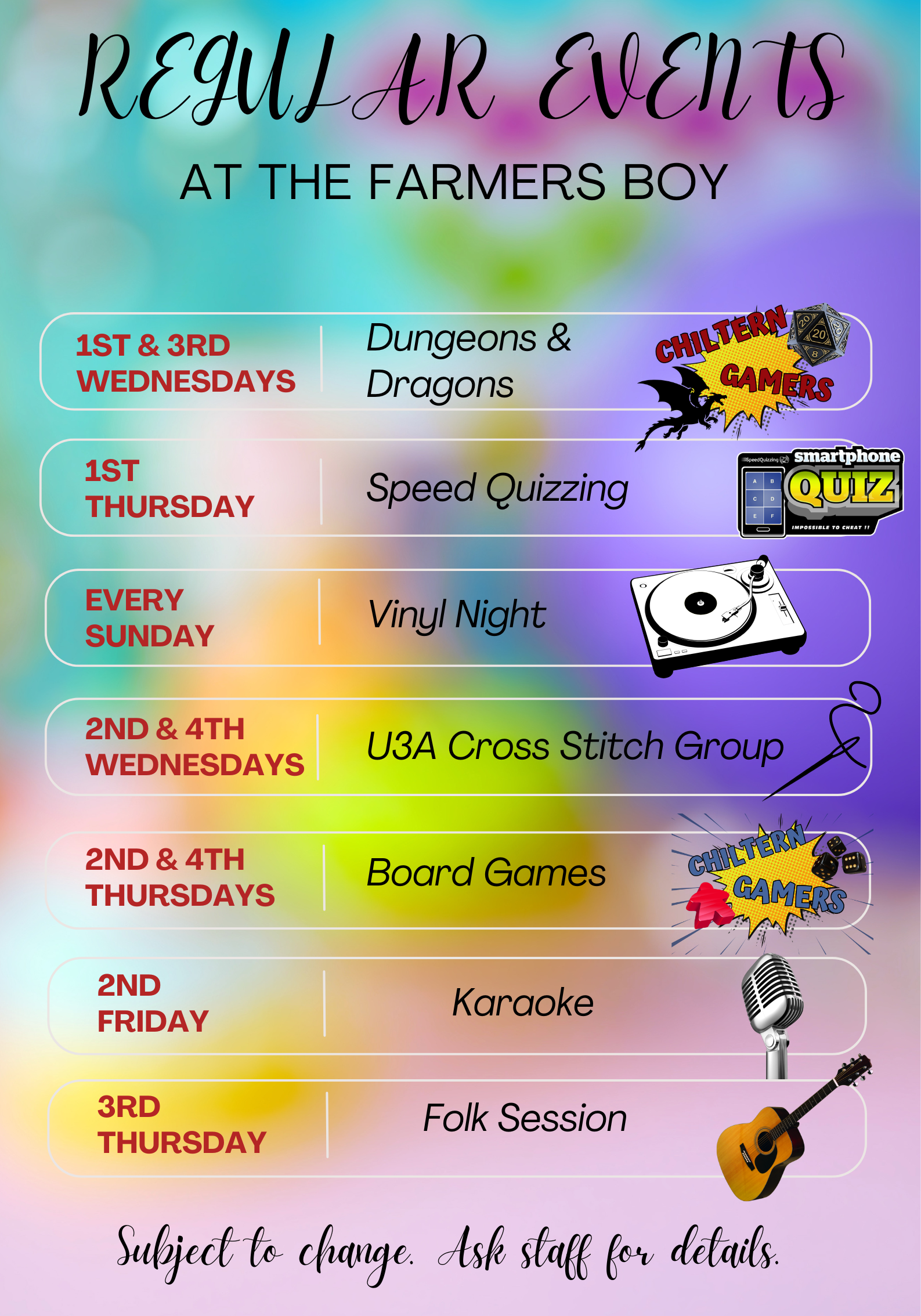 The menus on the website are samples of the wonderful food you can expect at the Farmers Boy. Items on the menu are subject to change.
